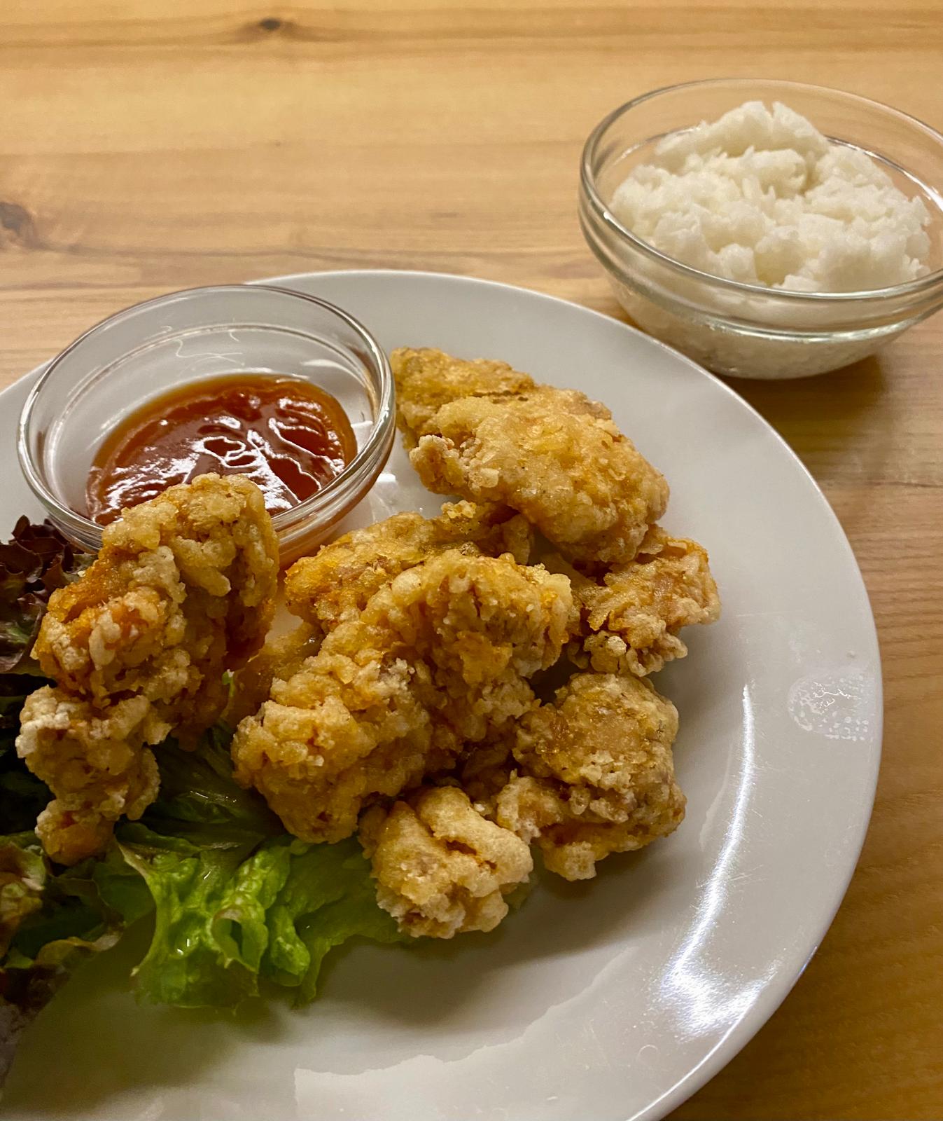 Karaage (Fritt. Hühnerkeulenschnitzel, glaciert in Soja-Knoblauch-Ingwer, mit Reis)
