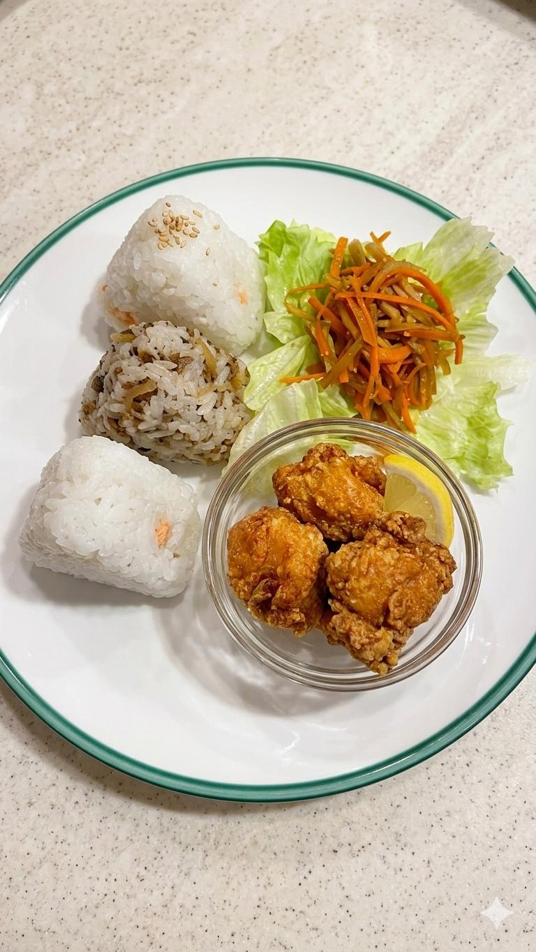 Karaage & Onigiri (Frittierte Hühnerkeulenschnitzel & dreierlei Reisbällchen (mit Räucherlachs, mit Thunfisch-Mayo, mit Garnele/Ei-Streifen) |